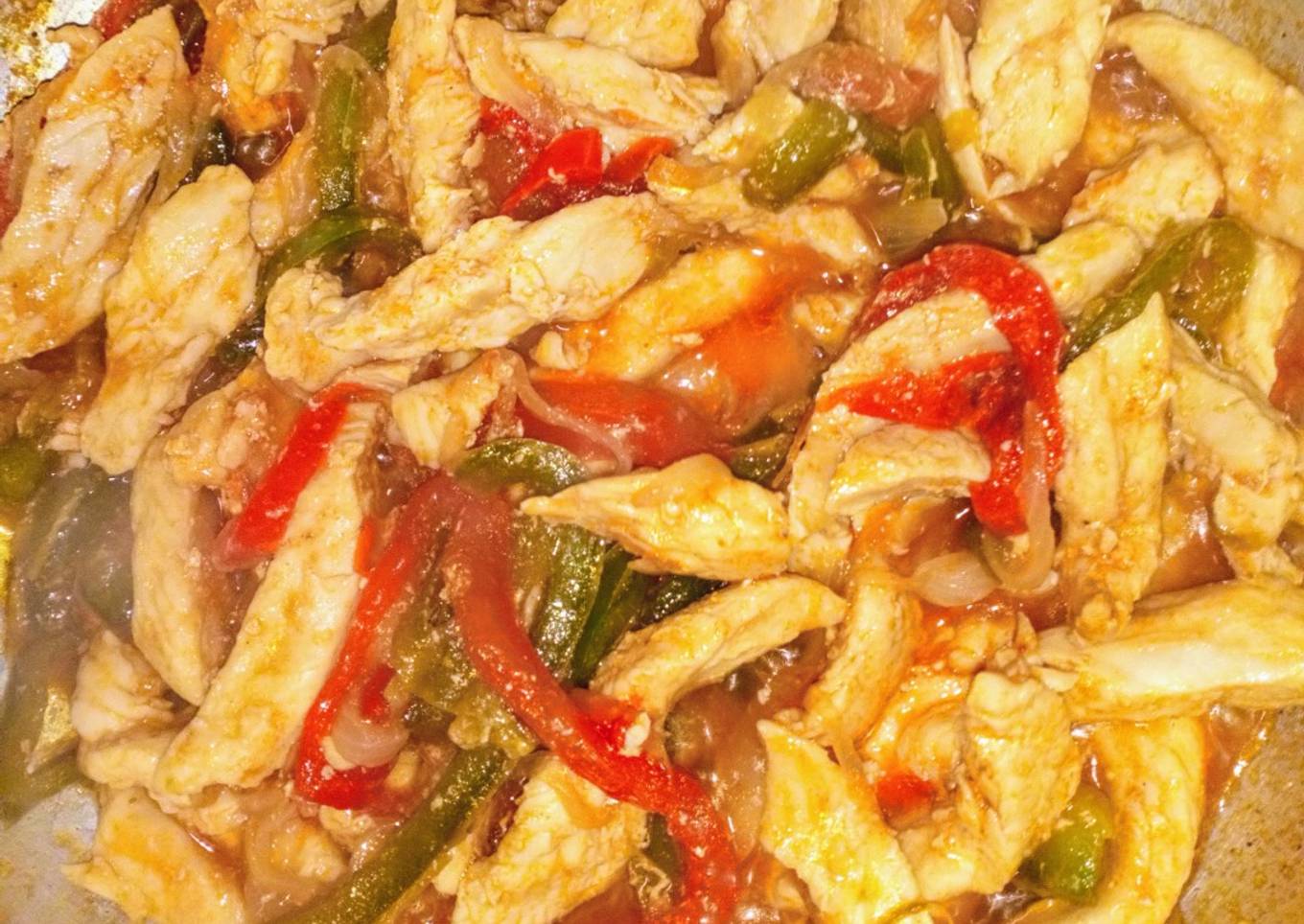 - Lavamos y cortamos la cebolla, y los morrones en plumas ponemos a calentar el aceite en una sart茅n o cacerola sofre铆mos los morrones y la cebolla por uno 3 minutos aproximadamente revolviendo de vez en cuando para que no se quemen ni se peguen o cuando veamos que empiezan a estar tiernos agregamos el pollo cortado en tiras