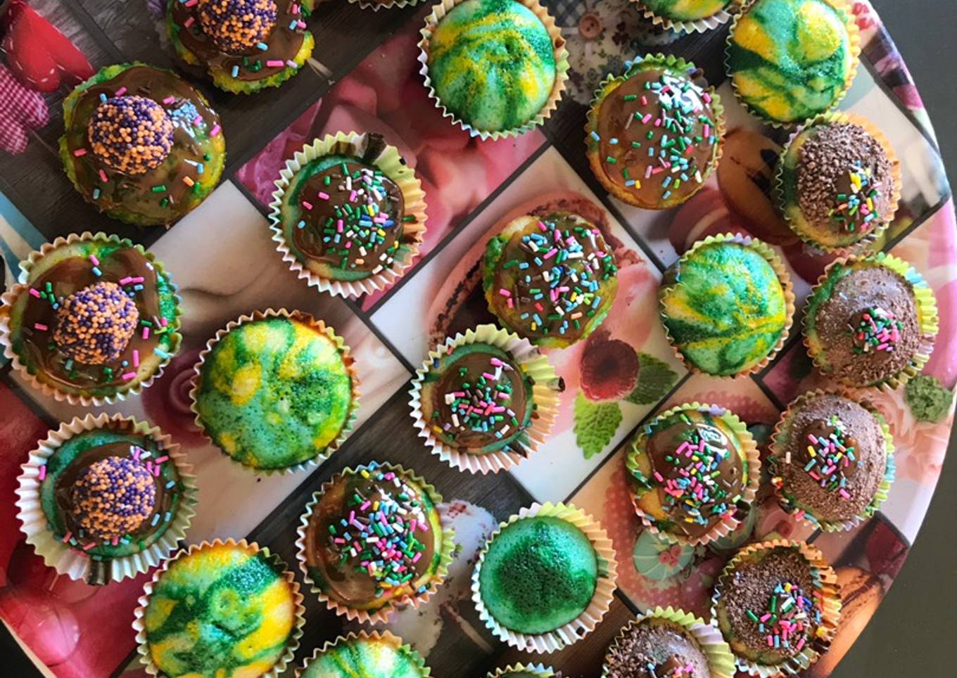 - En los porotines poner una cucharada de cada color (la masa tiene que estar a la mitad del porotin), meter al horno 15 min y decorar con granas, coco, dulce de leche, chocolate rallado, chips, gomitas. A disfrutar!!