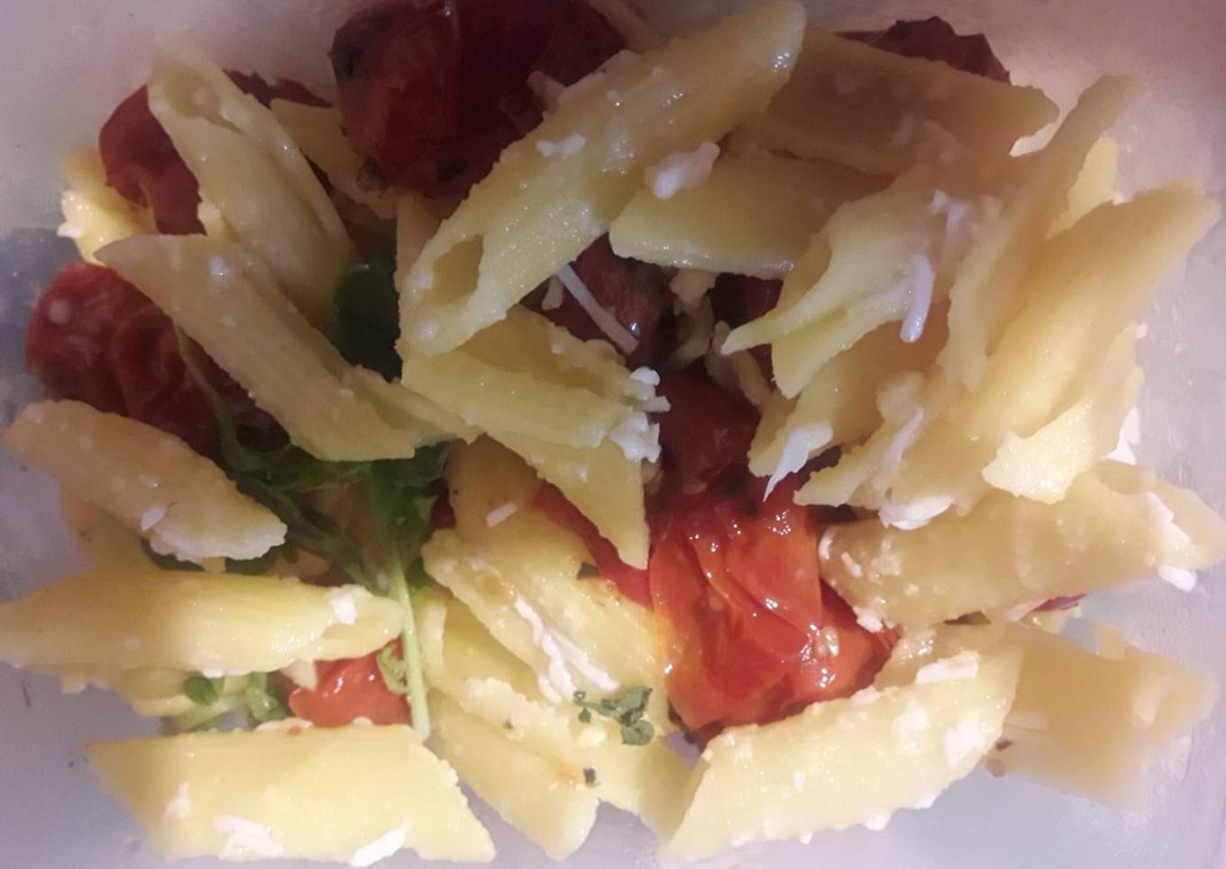 - Poner en una asadera los tomates cherry, espolvoreado con azúcar, orégano y aceite de oliva, los deje hasta que se "marchitaron"