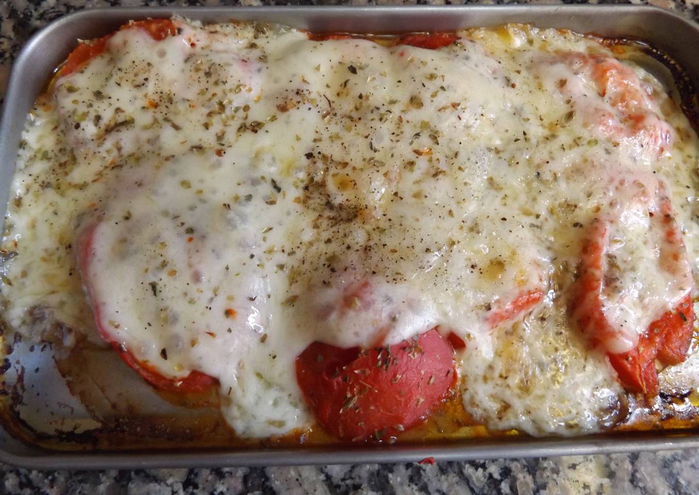 - Colocar el tomate en la placa. Llevar a horno precalentado a 180ºC durante 10´. Retirar del horno y cubrir cada rodaja de tomate con el queso y espolvorear con abundante pimienta. Poner nuevamente en el horno y dejar hasta que el queso esté derretido. Servir de inmediato.