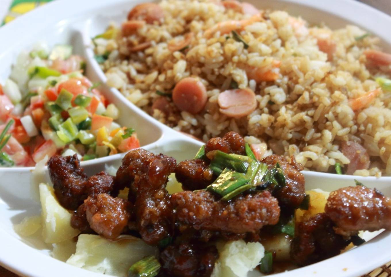 La comida asiática no tiene pierde, y si combinamos cocinas y estilos incluido el nuestro podemos obtener platos como este, me hace sentir realmente satisfecho el haber hecho este arroz chino, con un cerdo de la cocina japonesa y una ensalada de mi propia creación, una combinación de sabores múltiples que van desde el salado al dulce del cerdo pasando por el neutral y freso de mi ensalada. #conminombre