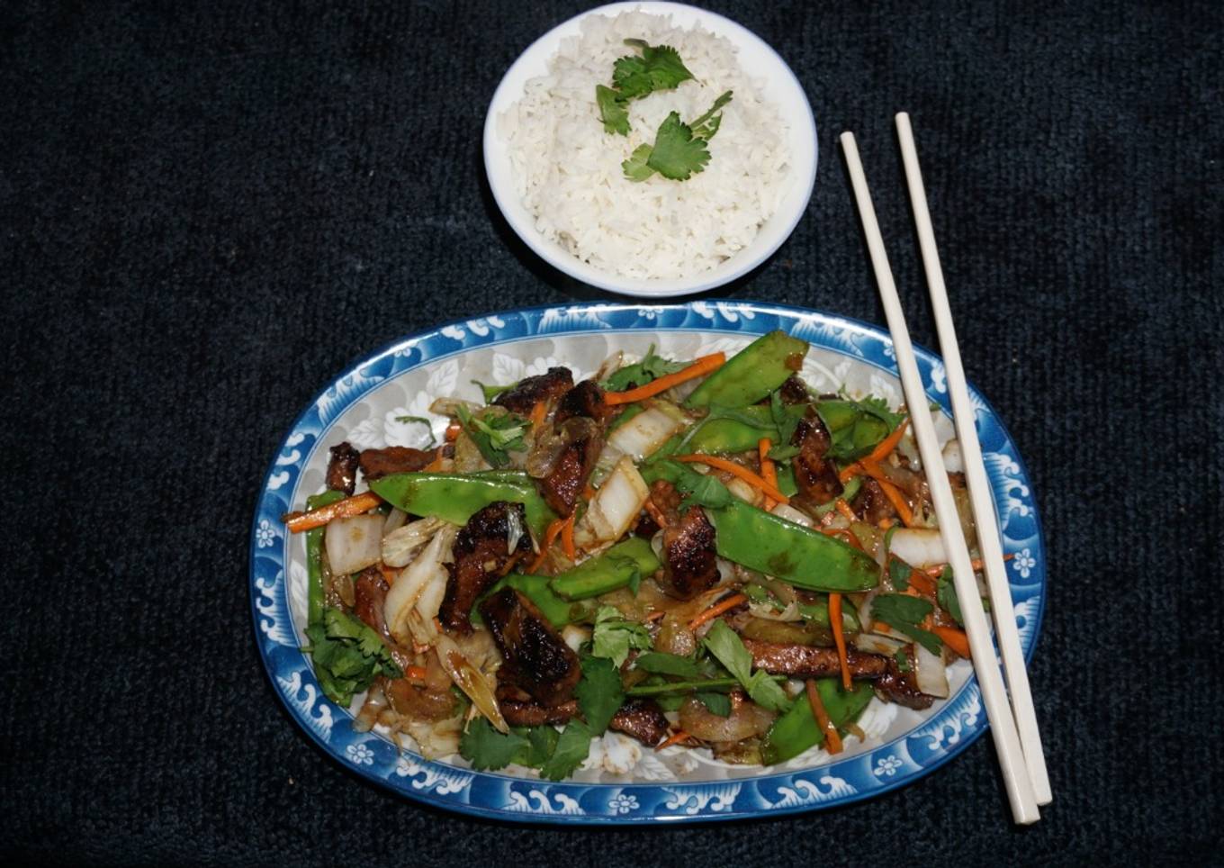 Hígado salteado con vainas de arvejas verdes y salsa teriyaki