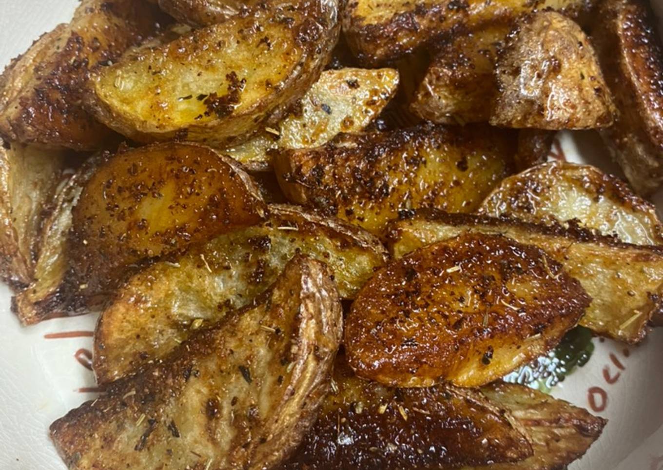 - 🥔 Aliñar con aceite, parmesano, sal, orégano, ajo en polvo, pimienta negra, pimentón dulce y remover.