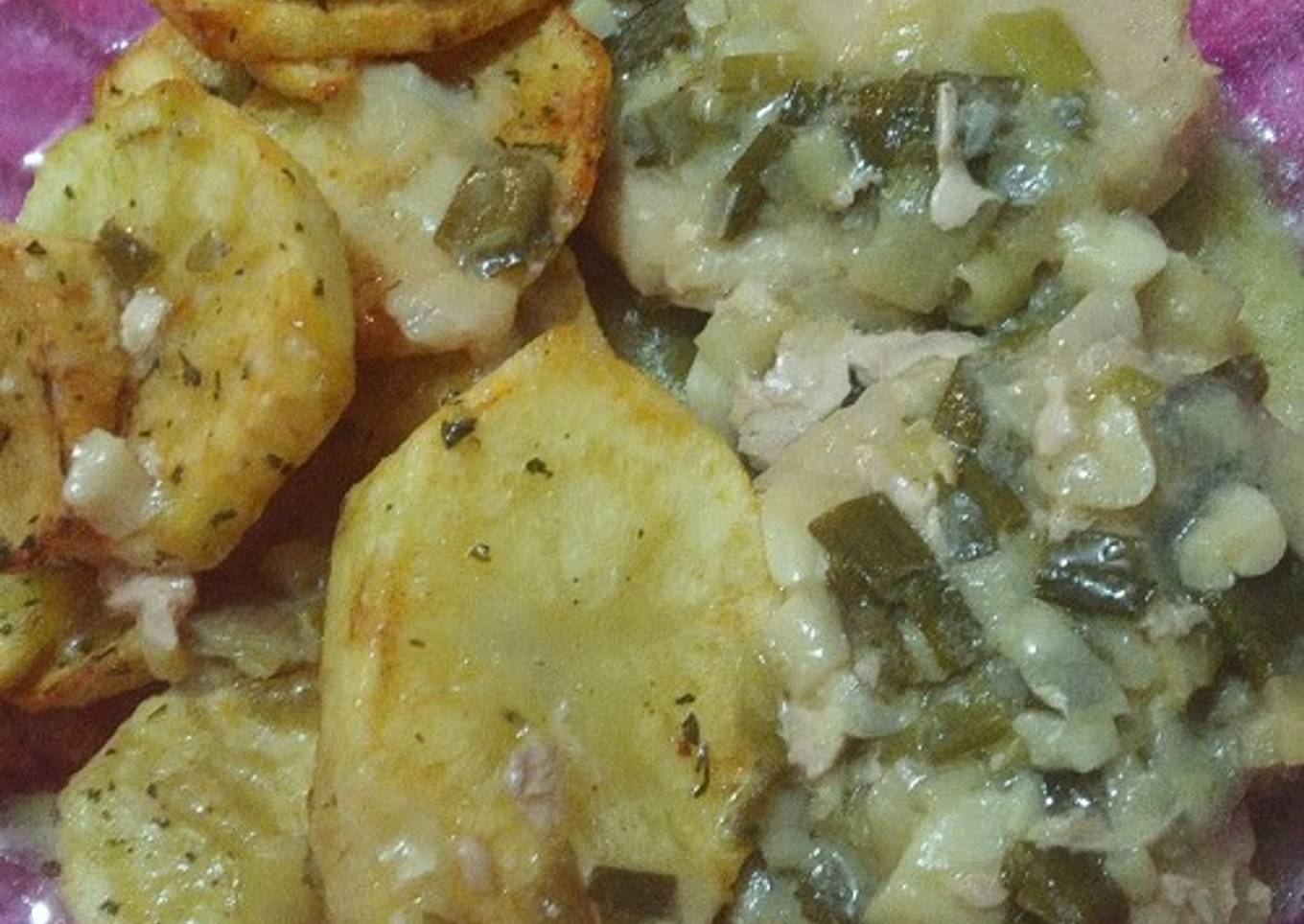 Pechuga a la cacerola con salsa blanca y verdeo. Y papas fritas