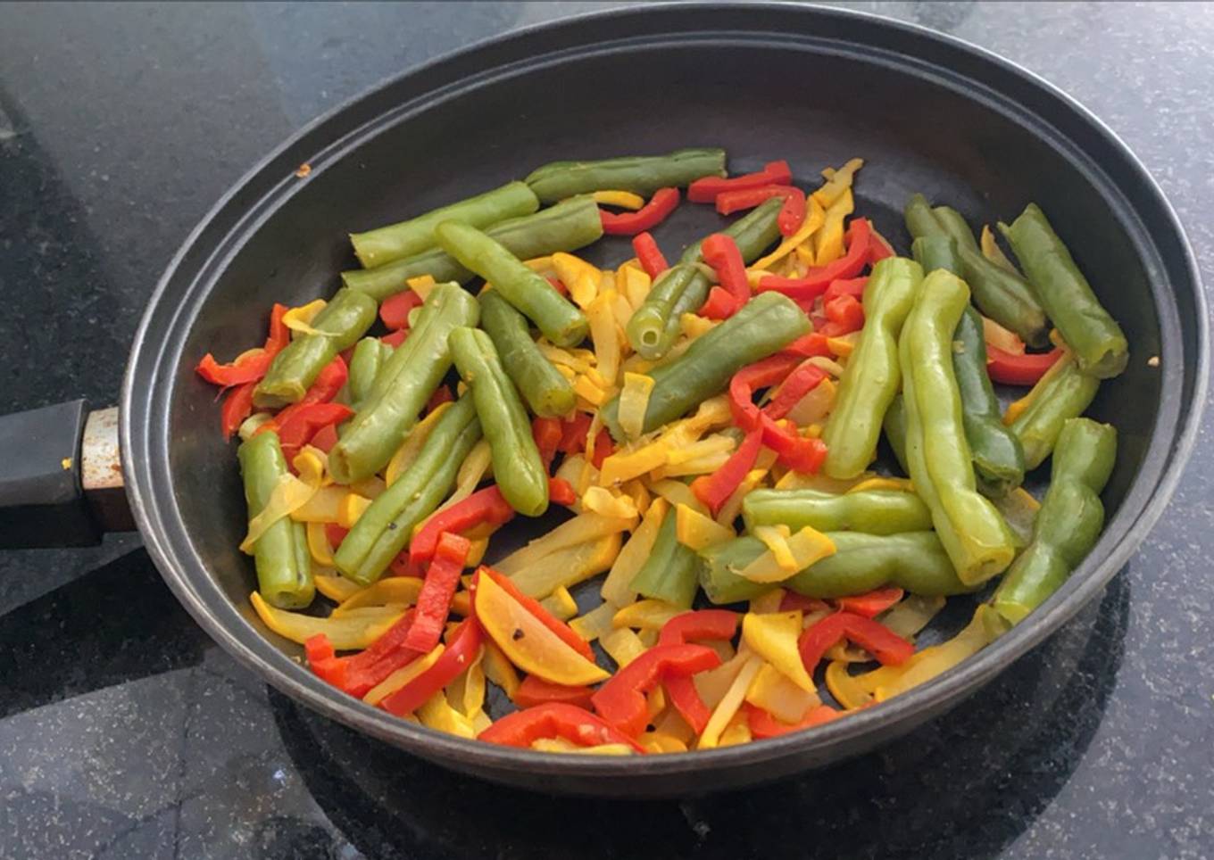 - Por último, cuando estén las habichuelas cocidas, agregamos todos los ingredientes en un sartén con una cucharadita de aceite y dejamos saltear los vegetales hasta que se absorba la cucharadita de aceite.