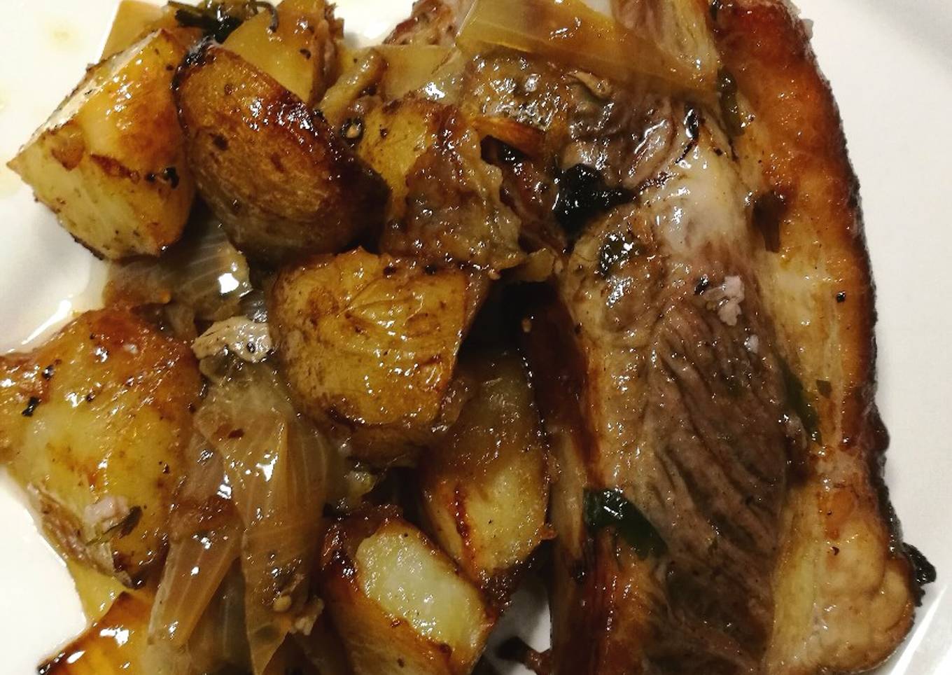 - Mantenemos unos 30 minutos y damos la vuelta. Rociamos con brandy. A帽adimos las patatas lavadas y sin pelar cortadas a dados grandes.