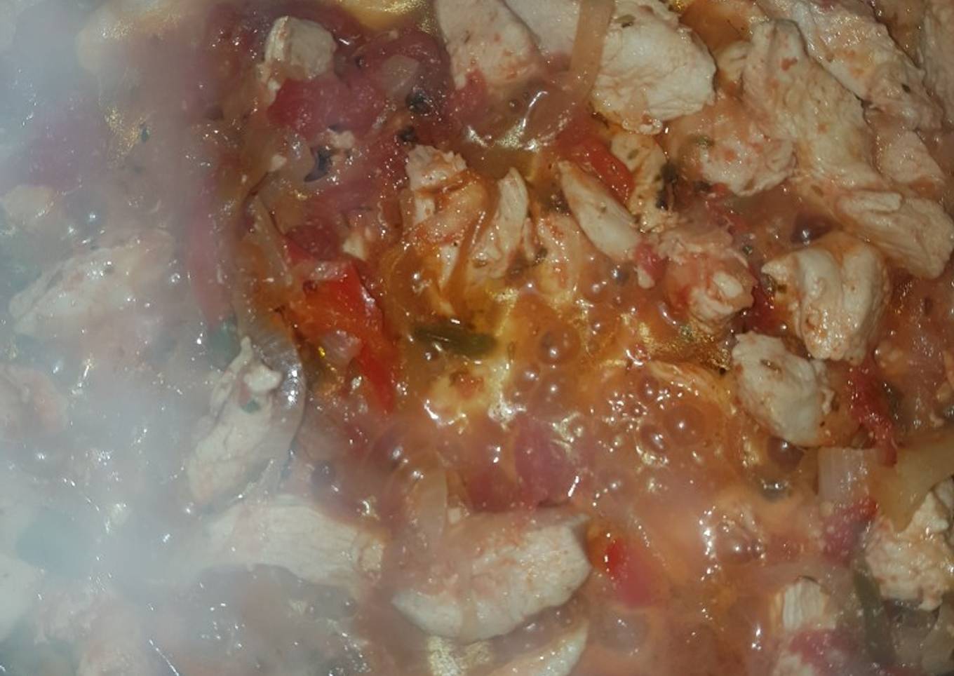 - Dejar que se dore y también poner el pollo cortado en tiras.