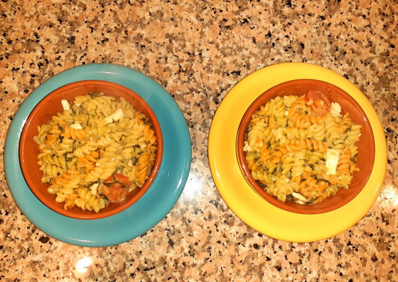 Tirabuzones con pollo, espinaca y tomates cherrys