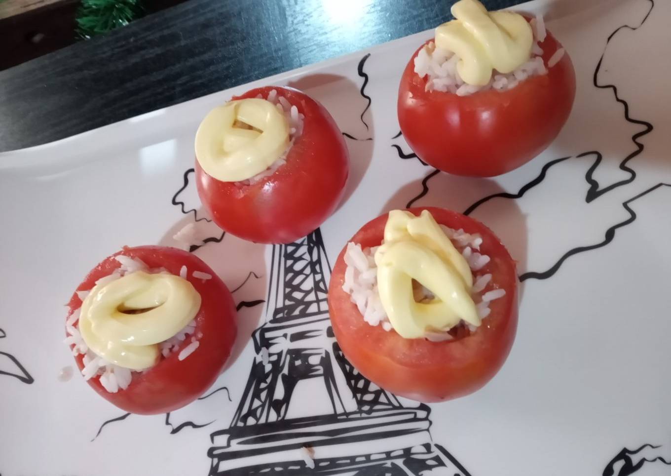 - Rellenamos los tomates con el arroz, le ponemos mayonesa encima a gusto. Y listo, a la mesa! Acompañamos con ensalada.. delicioso