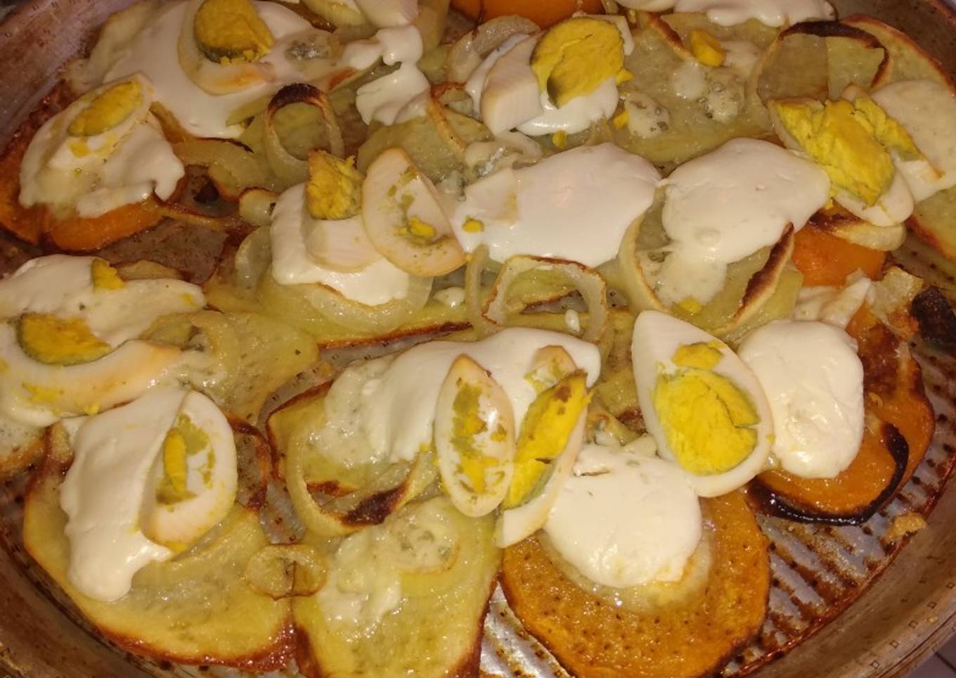 - Retirar la fuente del horno y colocar el queso en la superficie para gestionarlo, y colocar los huevos hervidos en trozos. (Según en gusto de los comensales también se puede agregar un poco de queso azul para realizar el sabor) polvorear el orégano una vez molido y retirado los palos sobre la preparación y regresarla al horno 5 a 7 min