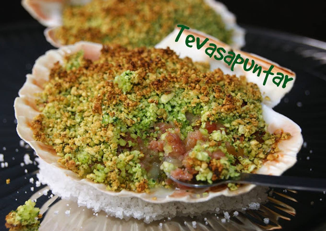Hacemos una picada con panko o pan rallado, perejil y un diente de ajo y espolvoreamos cada una, llevamos al horno precalentado a 180º, unos 8 minutos, que veamos que comienza a dorar, ya os comente en la otra receta que si ponéis sal gorda bajo la concha, no se moverá en el horno. - Servir al momento, bien calientes, salpicando unas gotas del vino que hemos utilizado y a disfrutar de un plato diez. Tevasapuntar.