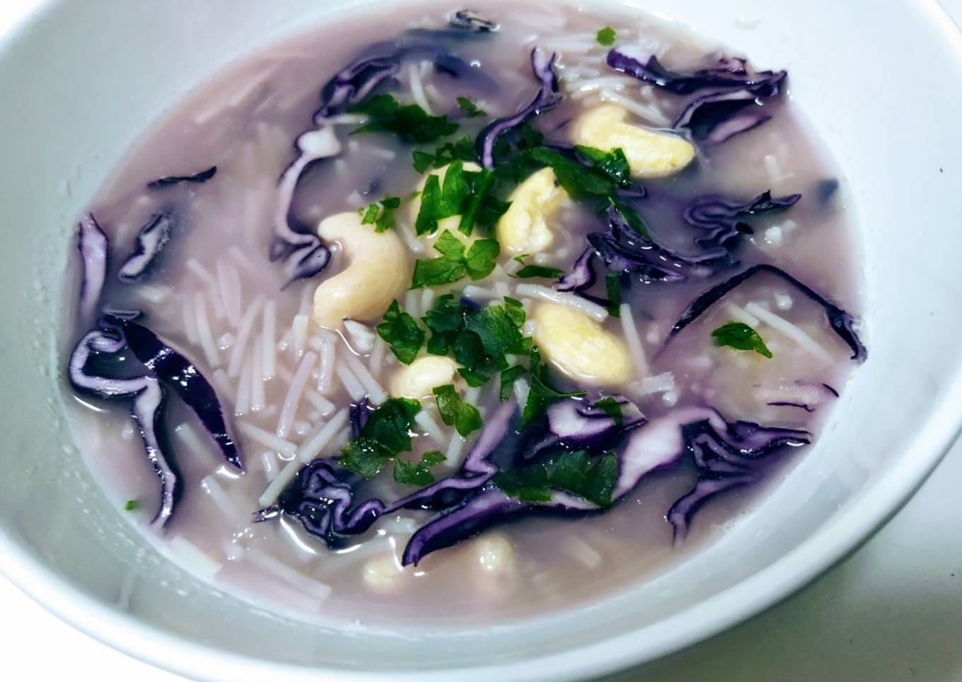 Hey everyone, I hope you are having an amazing day today. Today, I'm gonna show you how to make a distinctive dish, Caldo con fideos de quinoa y arroz, lombarda y anacardos. One of my favorites. For mine, I am going to make it a bit unique. This is gonna smell and look delicious.