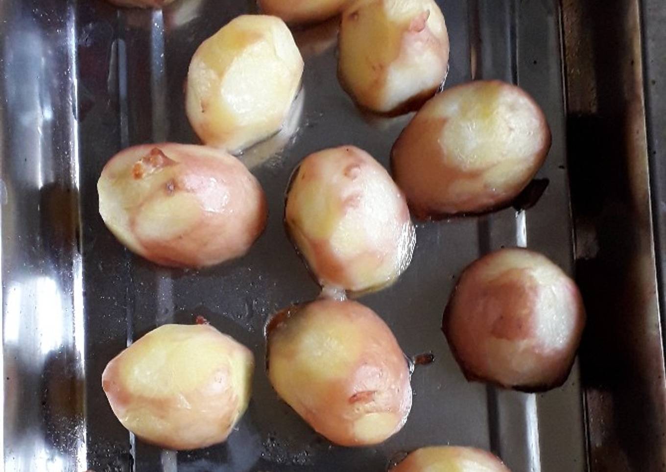 - Se cuecen las papas en agua salada, luego se pelan, se colocan cortadas en mitades en una fuente aceitada y se lleva a horno caliente, hasta que se doren.