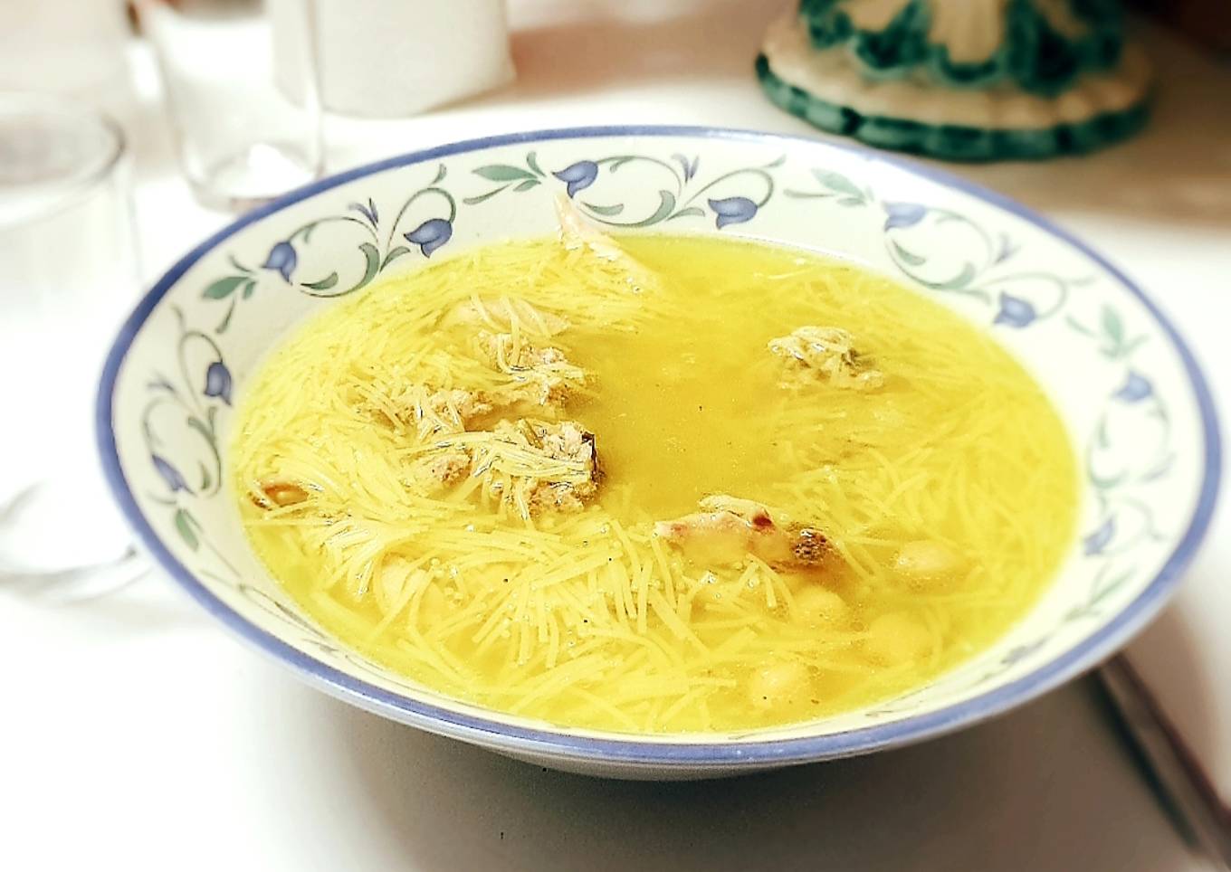 - Yo retiro la verdura cuando este y agrego los garbanzos 10 minutos más a fuego lento, si son secos ponerlos al principio, una vez hecho, a mi me gusta desmenuzar el pollo, en un cazo hacer los fideos y poner el pollo, los garbanzos y los fideos en un plato