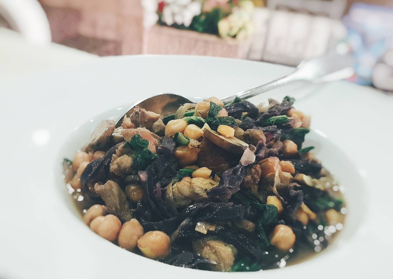 - Una vez pochado, añadimos las setas, la col lombarda, el pavo, los garbanzos, las especias y la sal. Rehogamos un poco más y cuando lleve unos minutos añadimos el vino y tapamos, dejamos que se evapore el alcohol