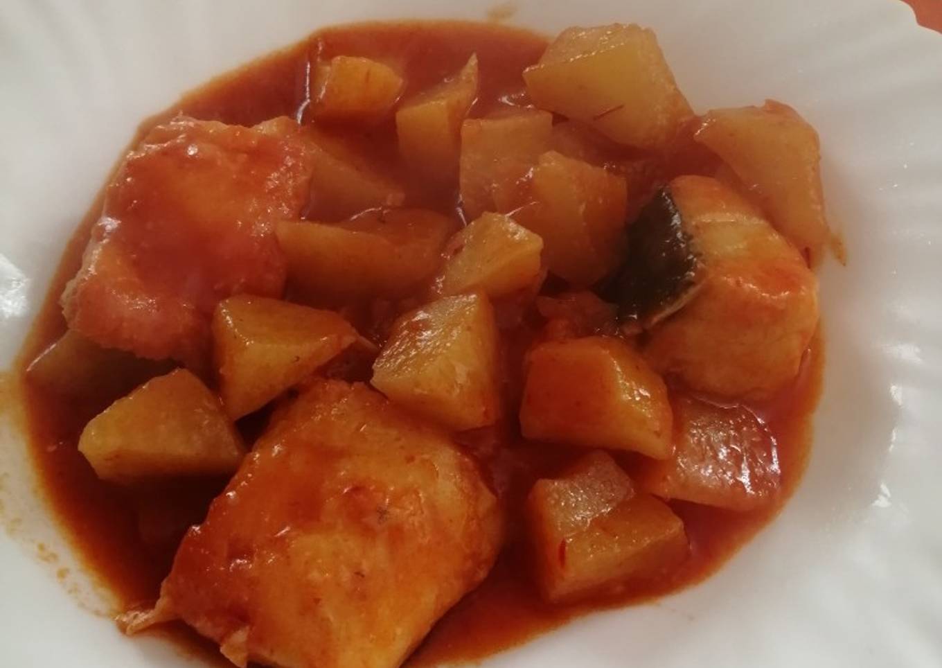 - Sería pochándolo todo y añadir patatas, pimentón, sal y salsa de tomate. Luego el agua para que hierva un poco y finalmente poner el bacalao previamente frito con rebozado de harina y terminar de hacerse.