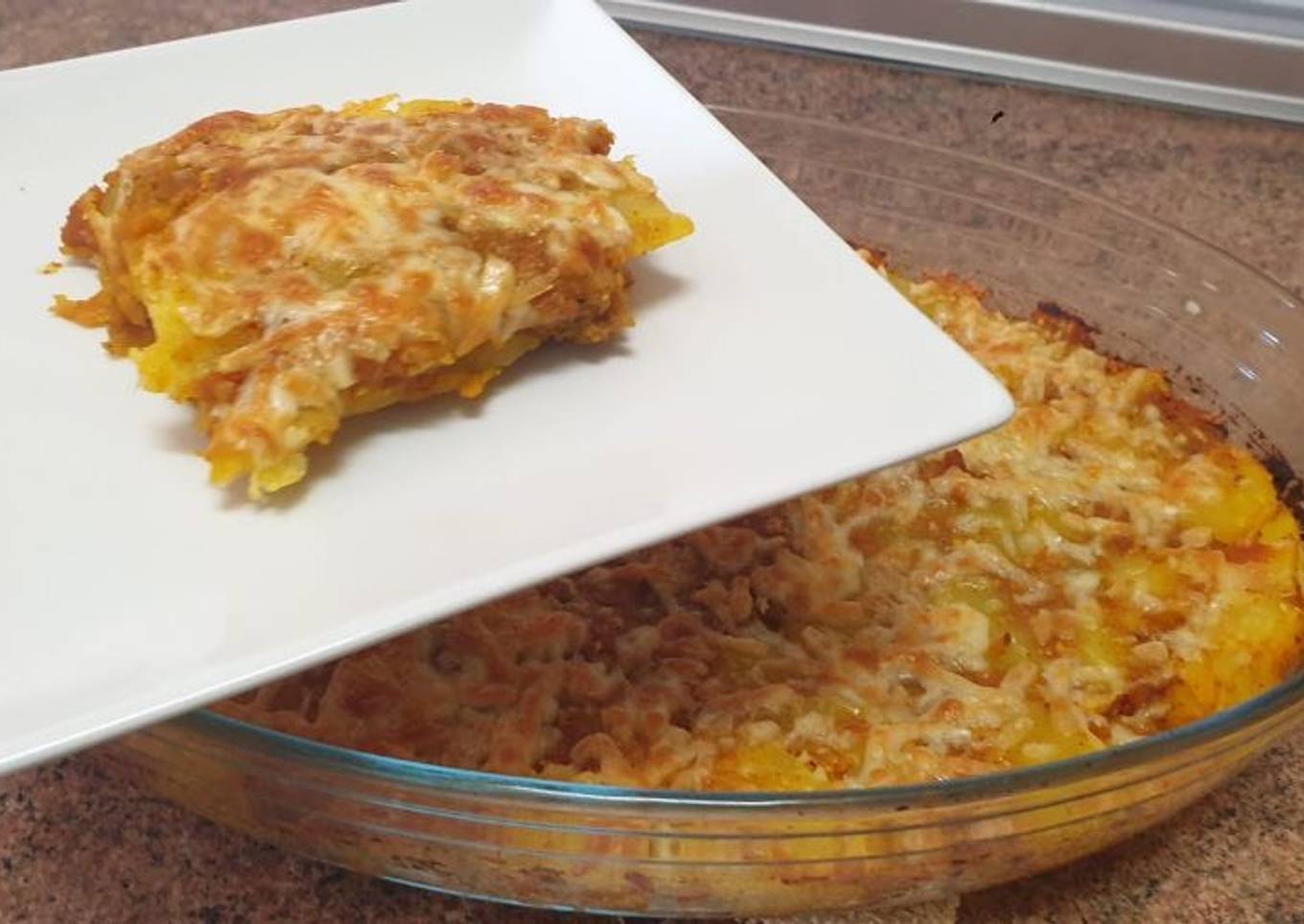 - Finalmente en un molde ponemos las patatas cocidas y la salsa de tomate con la carne mezclamos todo y ponemos el queso mozzarella por encima, la metemos en el horno durante 15 minutos y ya está nuestra cena que aproveche😘