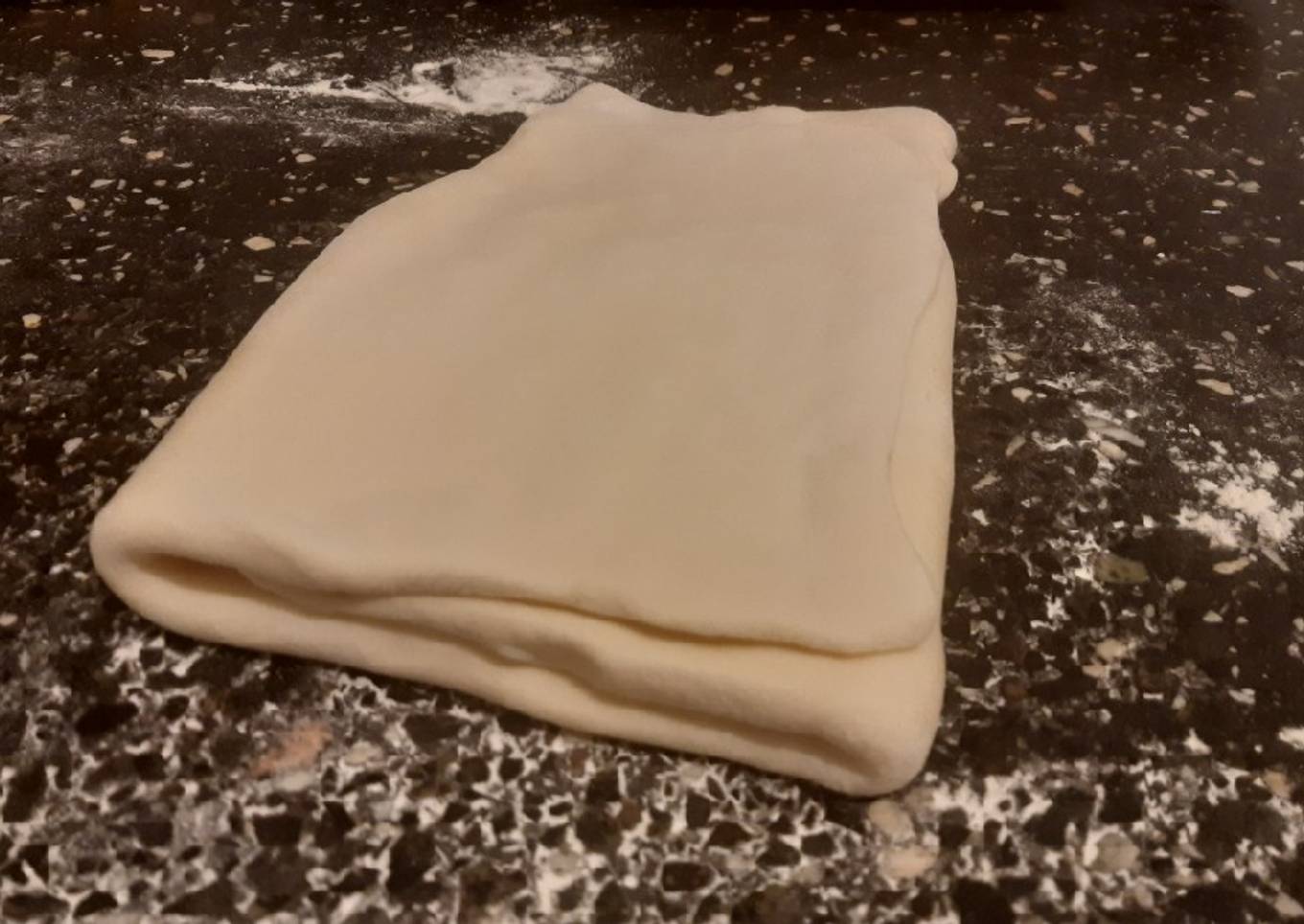 - Estira la masa encima de la mesa enharinada. Forma un rectángulo en el que pueda entrar el cuadrado de manteca dos veces aproximadamente. Doblar la masa cubriendo la manteca por encima. Estirar un poco la masa para cerrar los bordes para que tenga el mismo tamaño que la manteca