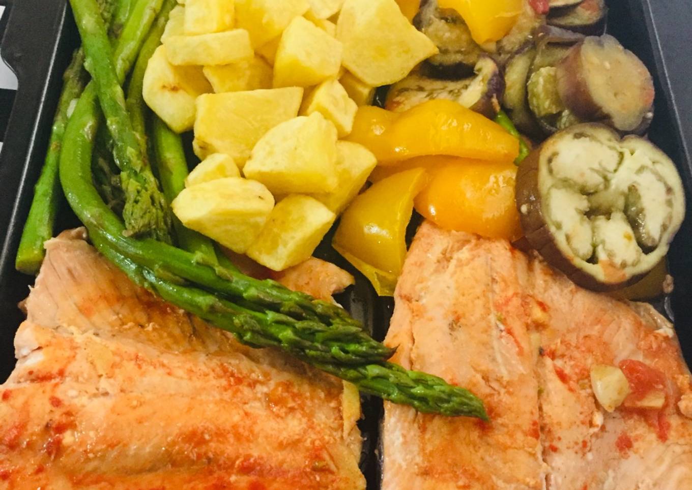 Steps to make to make Lomo de Salmón a la Plancha Con Vegetales y Papas Al Horno!