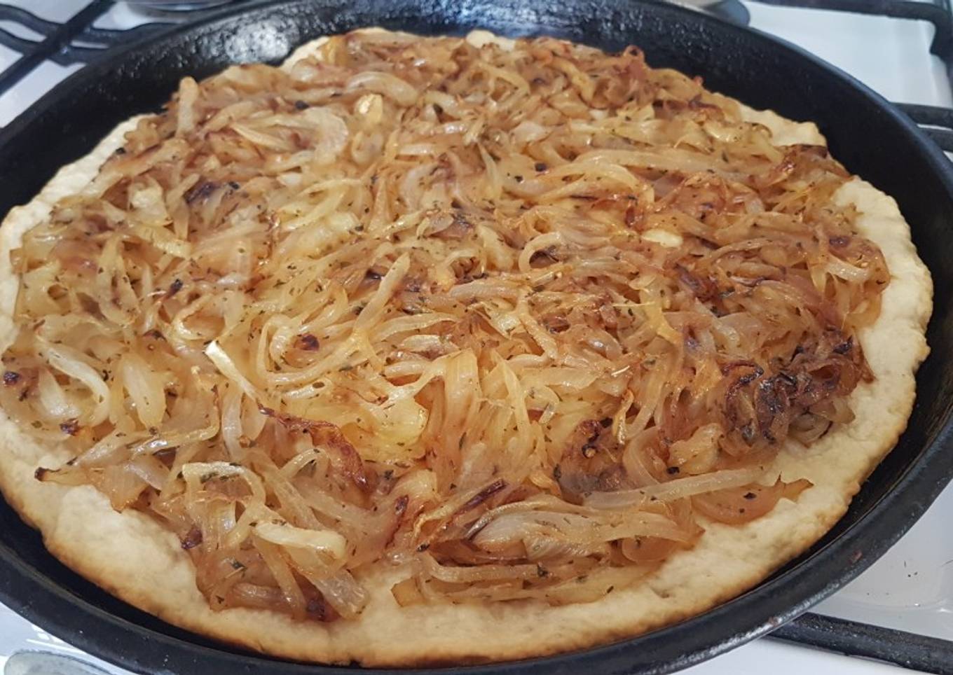 - Una vez que llegamos a los bordes, colocamos las cebollas encima, distribuimos para llegar a todos lados y listo, al horno hasta dorar la masa a gusto.